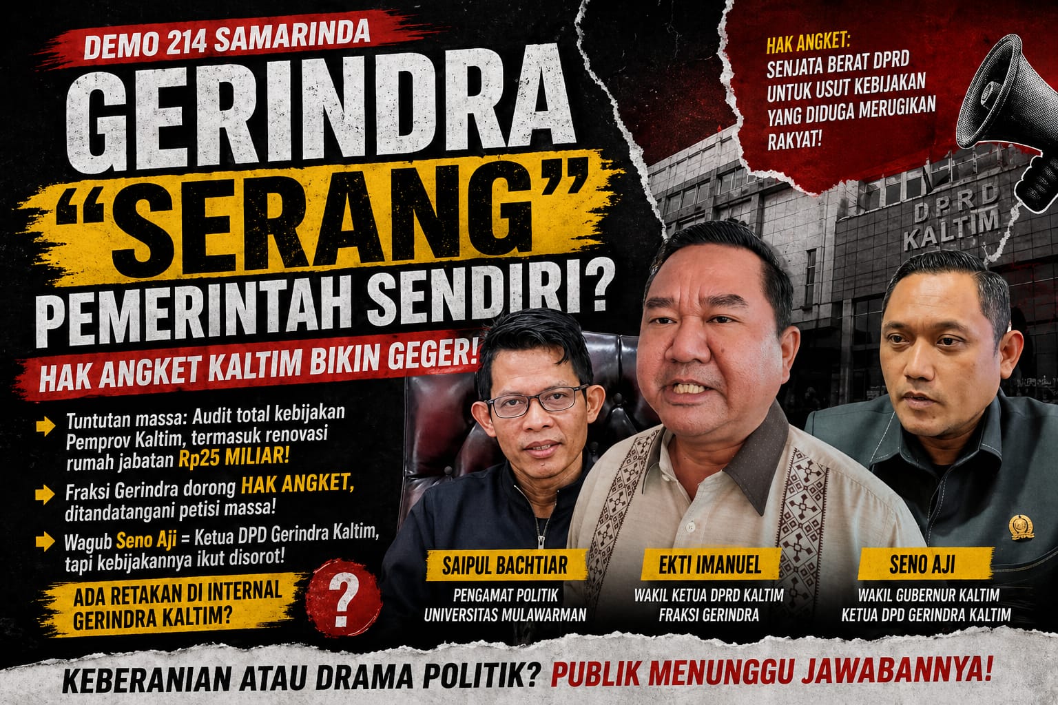 NUSSA.CO, SAMARINDA – Aksi 214 di Samarinda bukan sekadar unjuk rasa biasa. Ia menjelma jadi bara yang kini membakar panggung politik Kalimantan Timur. Desakan audit anggaran Pemprov Kaltim langsung menggoyang DPRD dan secara mengejutkan, pemicunya justru datang dari dalam: Fraksi Gerindra.