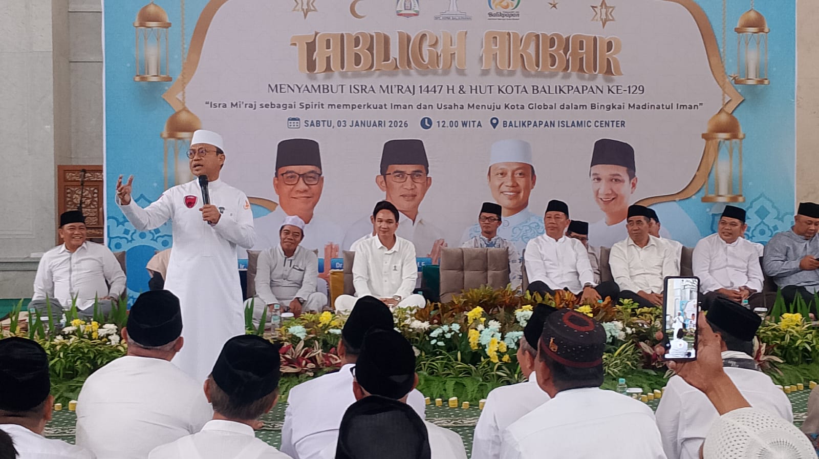NUSSA.CO, BALIKPAPAN – Pemerintah Kota Balikpapan menegaskan komitmennya membangun kota yang maju secara fisik sekaligus kokoh secara spiritual. Pesan tersebut disampaikan Wali Kota Balikpapan Rahmad Mas’ud melalui Penjabat Sekretaris Daerah (Pj Sekda) Agus Budi Prasetyo dalam kegiatan Tabligh Akbar peringatan Isra Mi’raj Nabi Muhammad SAW 1447 Hijriah yang dirangkaikan dengan Hari Ulang Tahun (HUT) ke-129 Kota Balikpapan, di Masjid Madinatul Iman (Islamic Center), Sabtu (3/1/2026).